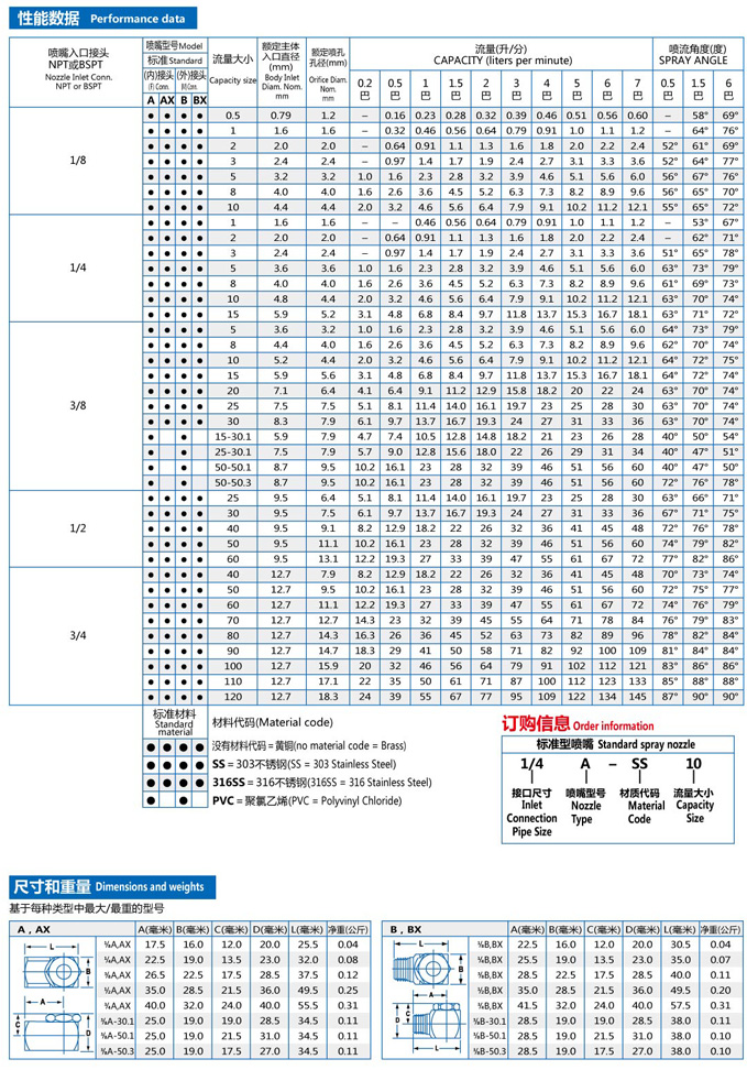AX-W和BX-W系列廣角扇形噴嘴具有與A-W和B-W系列同樣的性能,外加延長壽命的坡底設(shè)計優(yōu)點,